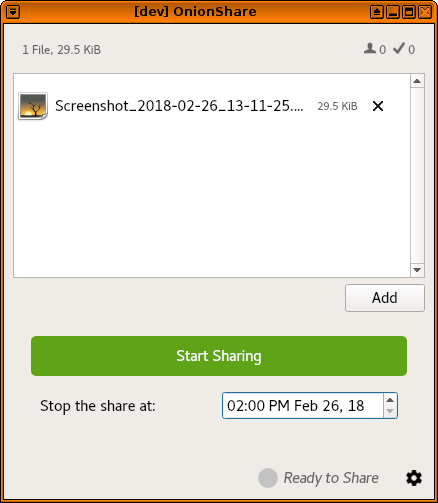 Another recent feature is the auto-stop timer. Already, OnionShare will stop the share as soon as the first download finishes (you can disable this in the settings if you want to send files to multiple people). But now, if the receiver doesn’t download the file after a specified amount of time, OnionShare will automatically stop sharing for you. For example, here I’m sharing a screenshot, but the share will automatically stop at 2pm: