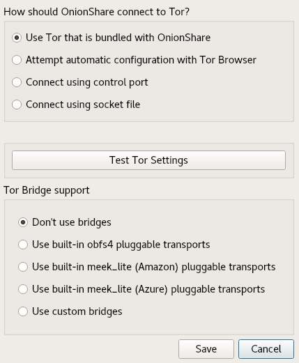 Here’s more information about how to connect to Tor, and using bridges, in OnionShare.