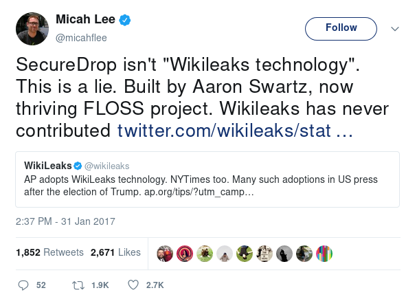 It's true that Aaron was inspired by WikiLeaks when he began development the DeadDrop project (which was later renamed to SecureDrop) in June 2011. But SecureDrop isn't "WikiLeaks technology." The WikiLeaks leak platform is proprietary, and unlike SecureDrop (which is a free software project) has never had a public security audit. Saying SecureDrop is WikiLeaks technology is a bit like saying "the iPhone is Nokia technology."