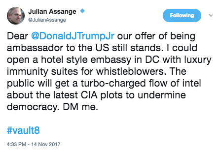 - WikiLeaks asked if president-elect Trump could award Assange with an Australian ambassadorship: "It would be real easy and helpful for your dad to suggest that Australia appoint Assange ambassador to [Washington,] DC."
