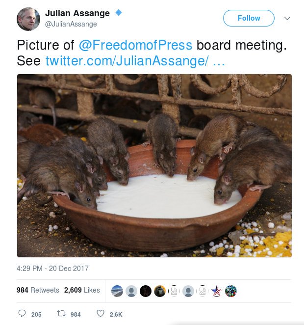 As part of the trolling campaign, Assange called us rats, and an official WikiLeaks Twitter account, along with swarms of WikiLeaks fans, piled on, using other anti-Semitic imagery and language.
