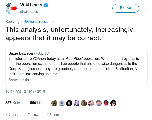 Seth Rich and Pizzagate are far from the only ones. WikiLeaks and Assange make off-hand conspiracy-ridden comments on a regular basis. In fact, I noticed WikiLeaks dip into the QAnon conspiracy theory in a reply to Roseanne Barr (if you'd like to lose some critical thinking skills, read the Twitter thread WikiLeaks is commenting on, and the replies to WikiLeaks; the QAnon people were pissed that WikiLeaks wasn't a true believer):