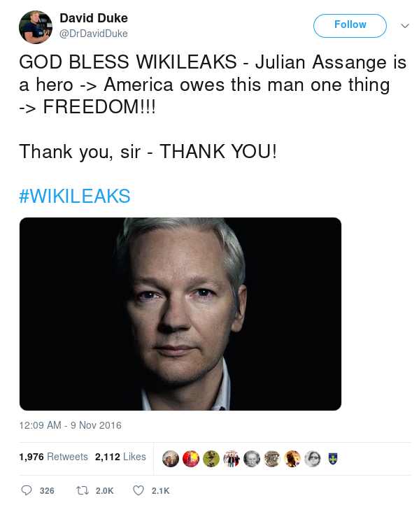 After Assange's role in the 2016 election, David Duke, former grand wizard of the Ku Klux Klan, personally thanked Assange.
