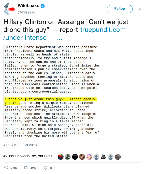 WikiLeaks tweeted a report from the right-wing fake news website TruePundit claiming that Hillary Clinton said, "Can't we just drone the guy?" about Assange. But they didn't just tweet it. As the Daily Kos describes, "Heck, Wikileaks tweeted it in monospace font with yellow highlight! That means it’s from some leaked document, right? Well, actually, Wikileaks put text from a right-wing website, TruePundit, in monospace font and highlighted the relevant quote." (Snopes says Clinton calling for a drone strike against Assange is "unproven.")