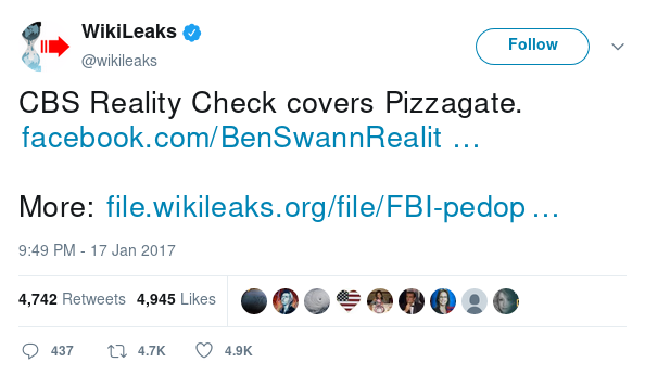 In order to promote the Pizzagate conspiracy, WikiLeaks tweeted a Ben Swann video segment (which appears to now be taken down) about Pizzagate.