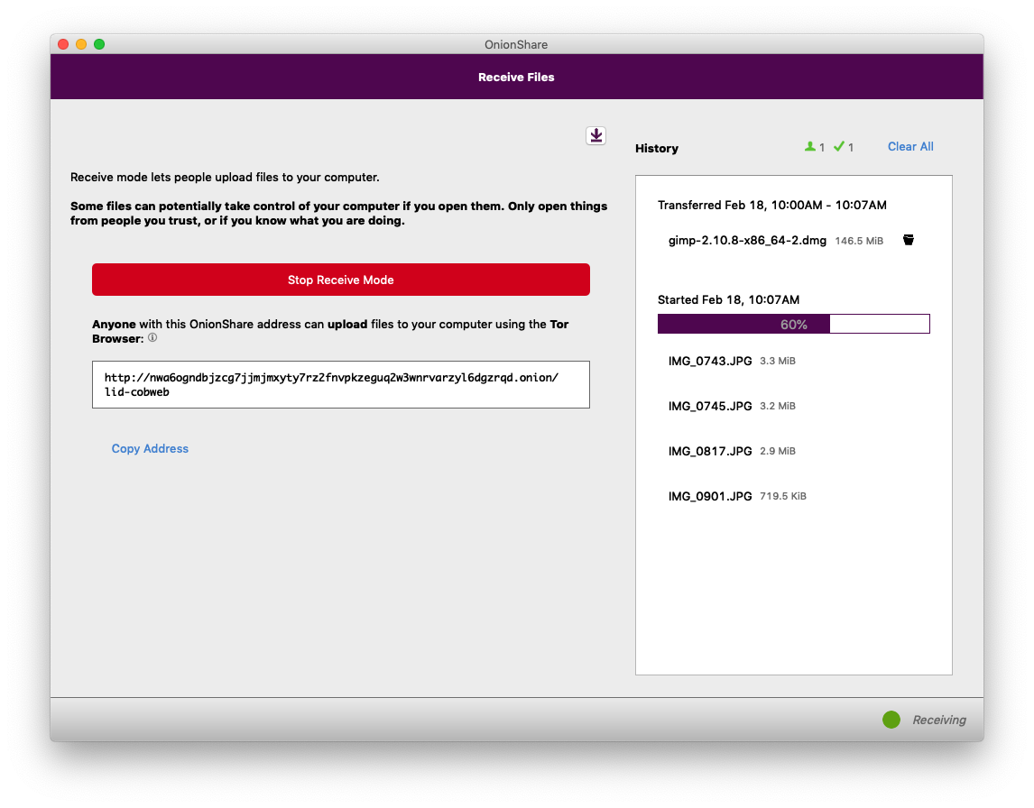 Over in OnionShare on my computer, I can see the status of all of the files that I'm receiving. Because OnionShare uses Tor onion services, I don't actually have any way of knowing who is sending files to me -- if I want to make it so only very specific people can send me files, I need to securely share the OnionShare address to only those people. My computer will continue to act as an anonymous dropbox until I click "Stop Receive Mode", or close OnionShare. And, just like with share mode, if I suspend my laptop, the OnionShare address stops working.