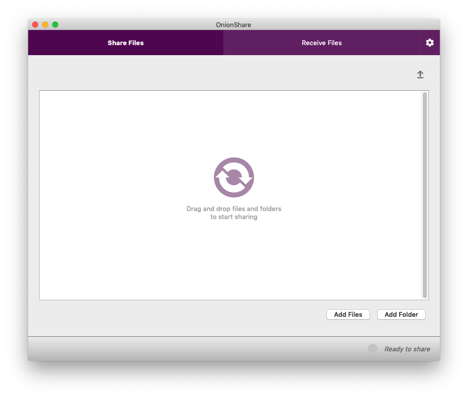 To securely and anonymously share files with someone, just drag and drop the files into the OnionShare window. Alternatively, you can click the "Add Files" and "Add Folder" buttons to browse your filesystem.