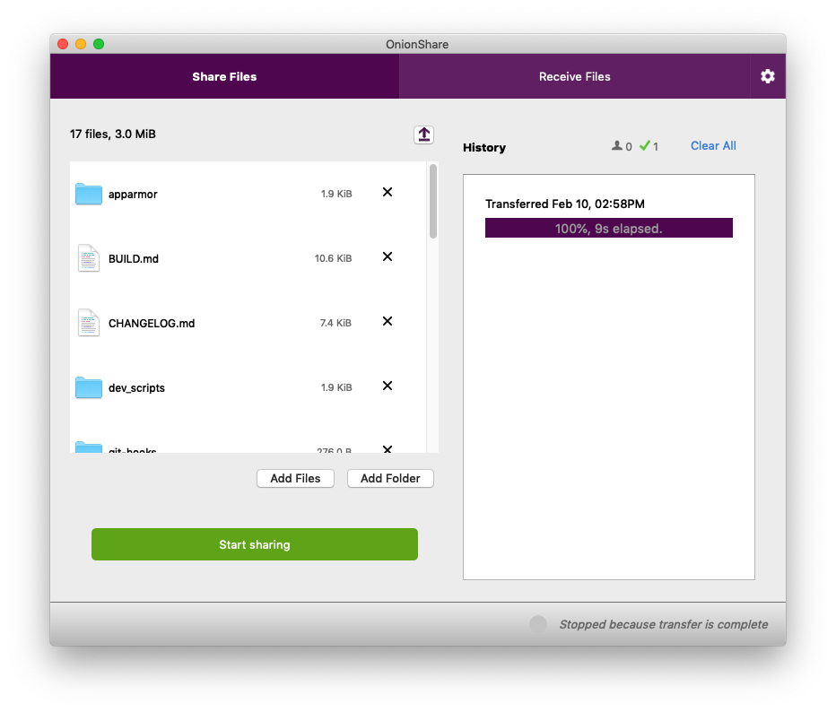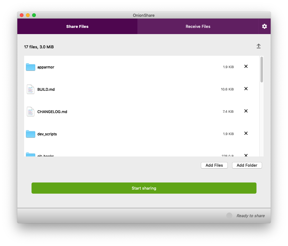 In Windows and Linux there's just a single "Add" button that lets you select both files and folders. The reason for two separate buttons in the macOS version is a bit complicated, but boils down to a cool new security feature: The macOS sandbox is turned on in OnionShare 2, which means that even if someone manages to exploit a vulnerability in OnionShare to try to hack your computer, they still won't be able to access your data or run programs on your computer without first escaping the sandbox.