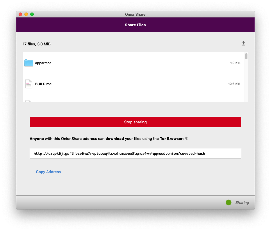 After clicking the button, I wait a few seconds, and then OnionShare gives me an unguessable Tor address to share. This is also new in OnionShare 2: By default, it uses next generation Tor onion services, also known as v3 onion addresses. These are onion addresses that look like lldan5gahapx5k7iafb3s4ikijc4ni7gx5iywdflkba5y2ezyg6sjgyd.onion, as opposed to the old v2 kind, that look like elx57ue5uyfplgva.onion.