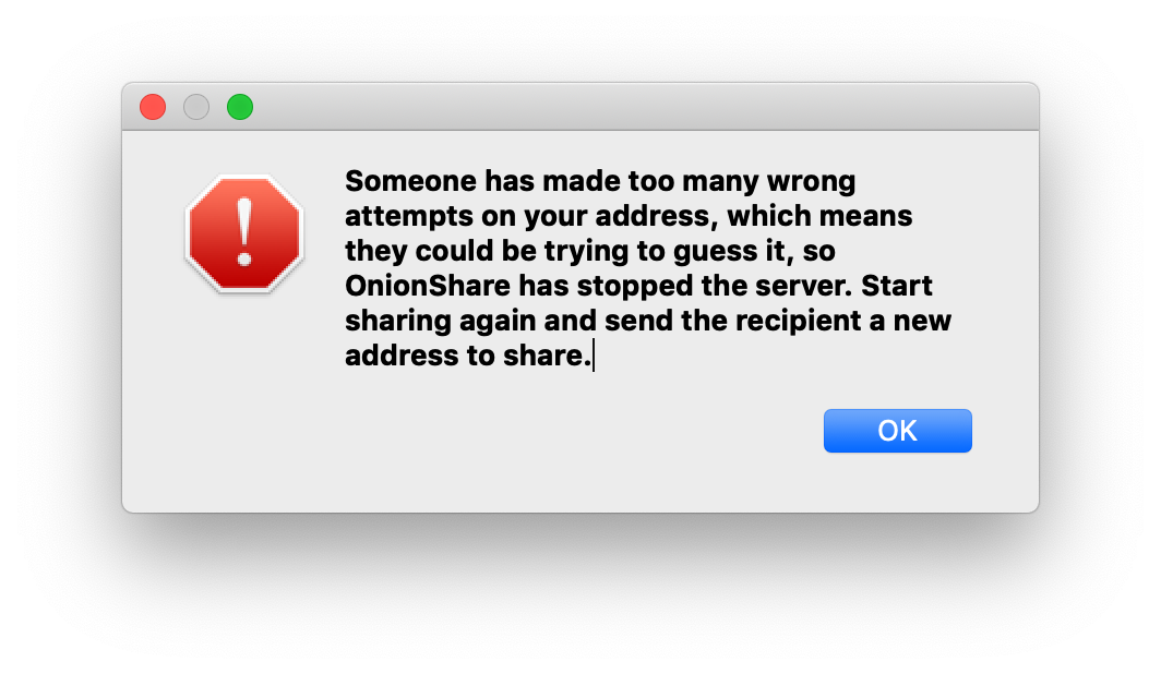 For example, let's say you want to anonymously publish some files. You disable the "Stop sharing after files have been sent" setting, drag the files into OnionShare, start sharing, and tweet the OnionShare address. It turns out that anyone on the internet that sees the tweet can force your server to stop just by making 20 404 errors. (This situation actually happened, by the way, and their server kept shutting down because people kept making 404 errors.)