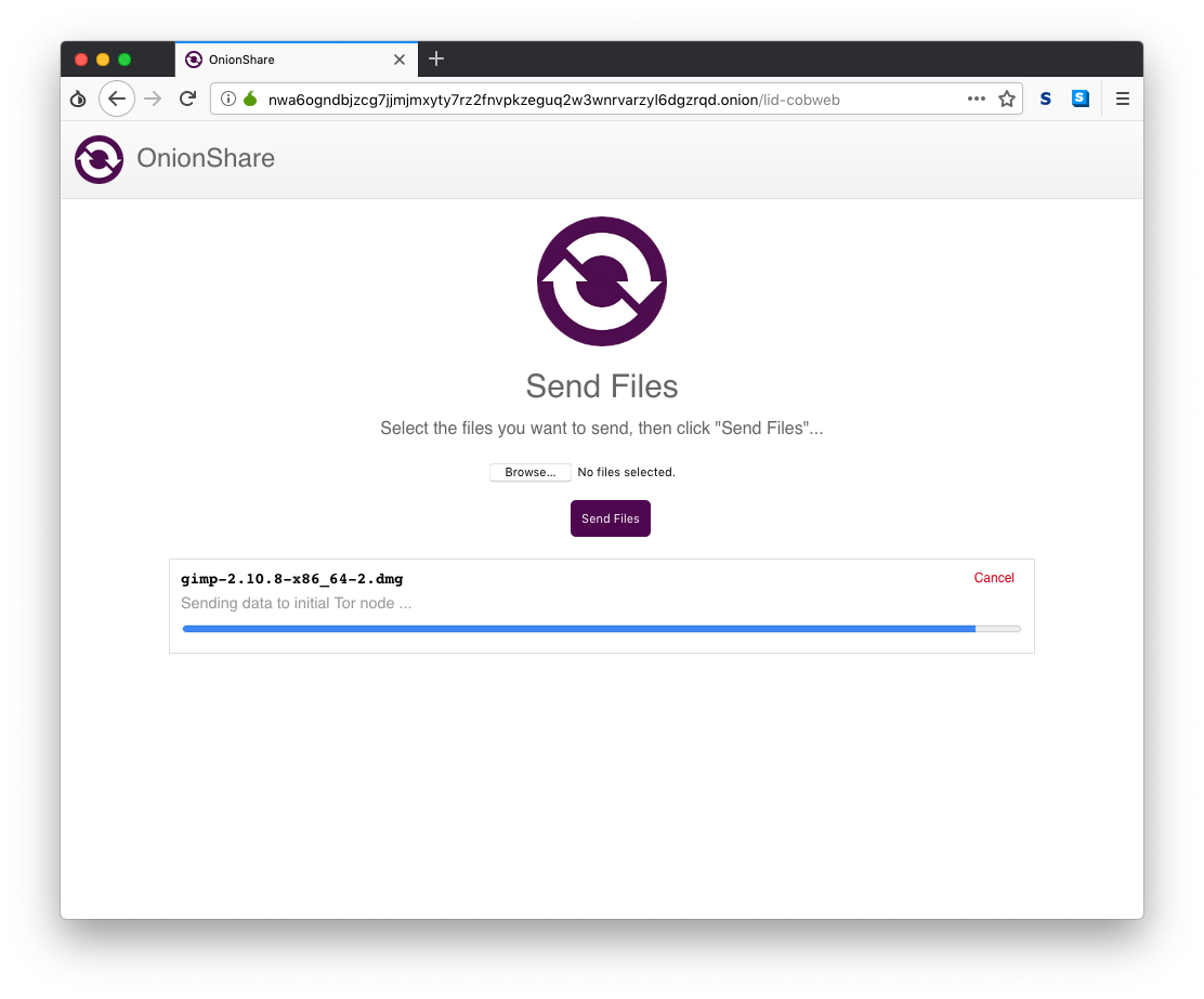 OnionShare is an open source tool for securely and anonymously sending and receiving files using Tor onion services. It works by starting a web server directly on your computer and making it accessible as an unguessable Tor web address that others can load in Tor Browser to download files from you, or upload files to you. It doesn't require setting up a separate server, using a third party file-sharing service, or even logging into an account.