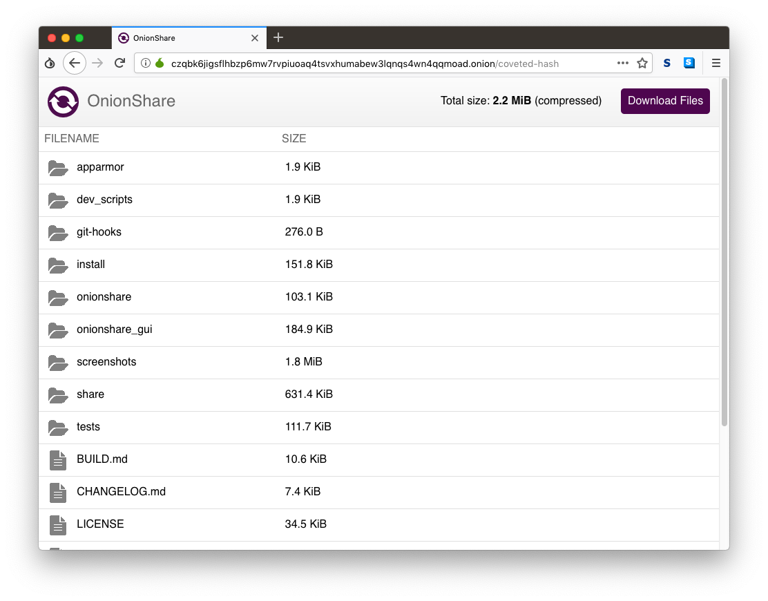 My friend then downloads the files, which are automatically zipped up. In this case, the zip file is called onionshare_snwga4.zip (the last part of the filename is random), and when she unzips it, she can see a copy of the OnionShare source code I sent. A new feature in OnionShare 2 is that if you share just a single file, it no longer zips it up (but still compresses it with gzip, built into the HTTP protocol).