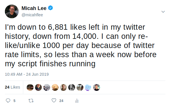 Twitter works in mysterious ways. If you have a very long like history, the only way to delete your old ones is to first relike those tweets (yes, the tweets that you already liked), and then you can unlike them. This means that your friends (and strangers) will get notifications that you, for example, liked a random tweet from 2014 but by the time they open Twitter the notification will be gone, and you won't be listed in their likes for that tweet. And on top of that, running this script may take weeks. Twitter only allows you to like up to 1,000 tweets per day, so if you need to relike/unlike about 10,000 tweets (this is what I did), it will take about 10 days to run. I had maybe a dozen different people contact me wondering if my account was hacked.