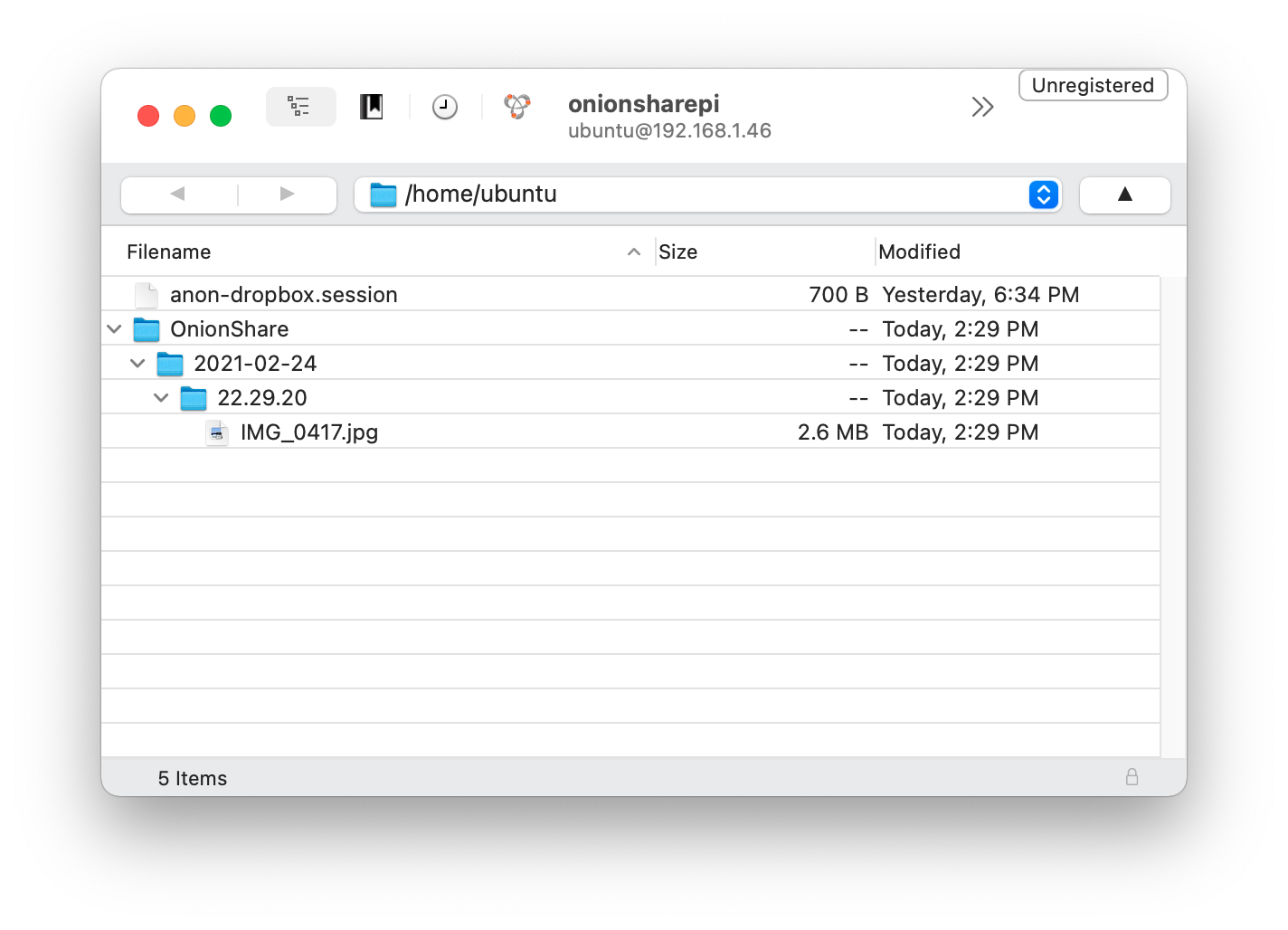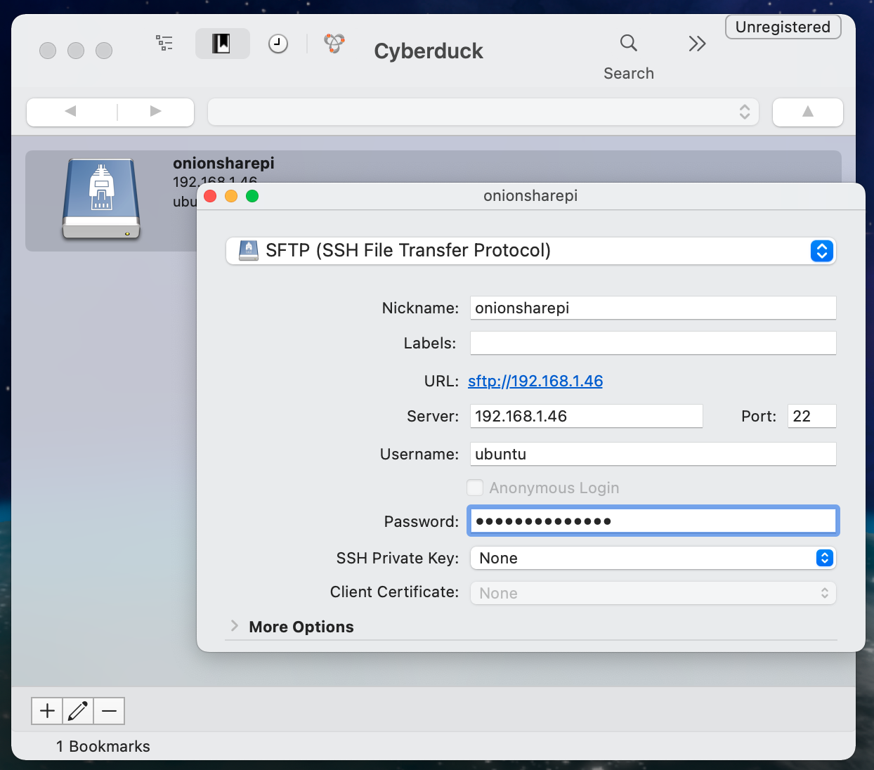 If you use macOS or Windows you can use SFTP software like Cyberduck. For example, here I'm setting up a new connection in Cyberduck called onionsharepi: