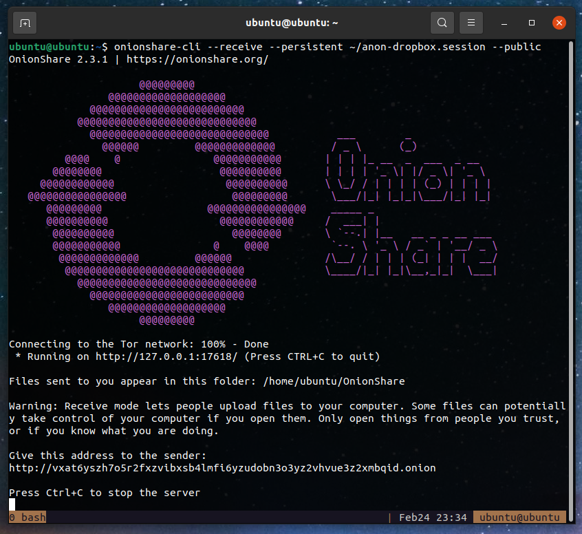 The command we used to start OnionShare in receive mode is: