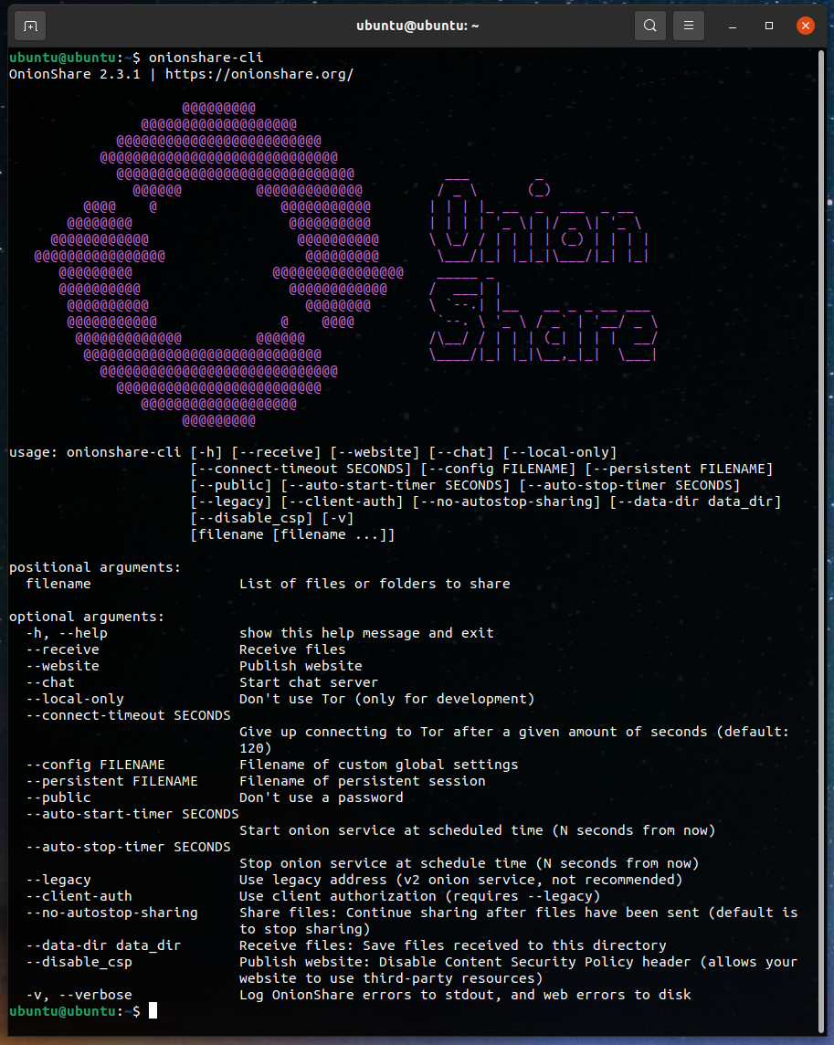 Okay, now try running onionshare-cli. You should see the usage information: