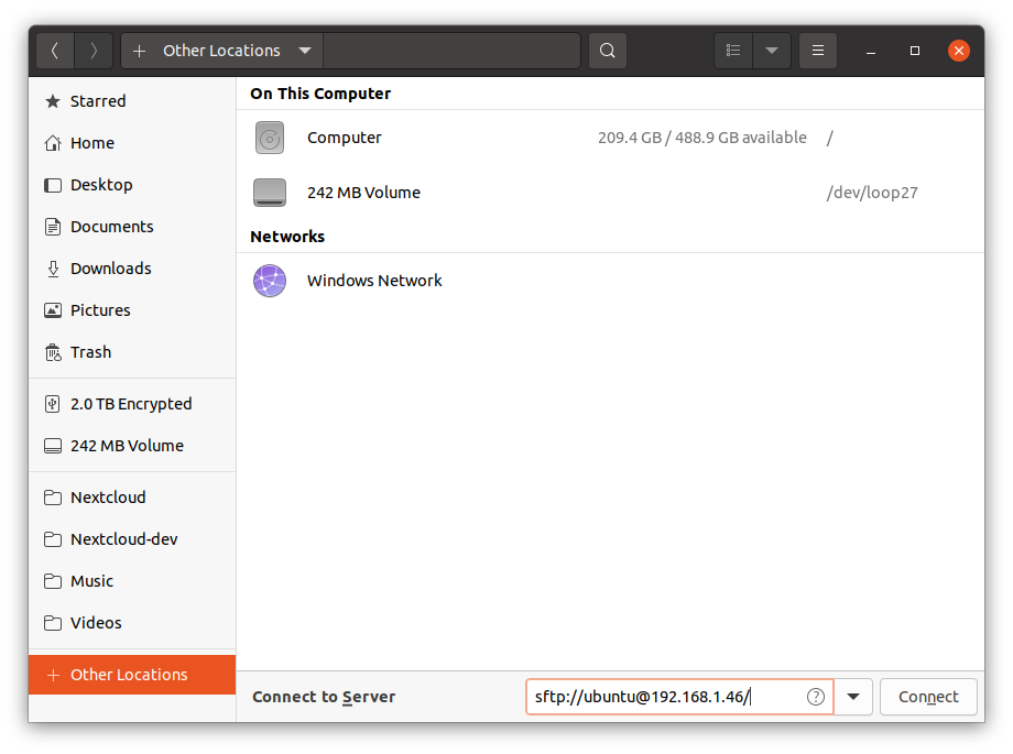 In Ubuntu (or other distros that use nautilus as the file manager), I open the file manager, go to "Other Locations", and connect to the server sftp://ubuntu@192.168.1.46/.